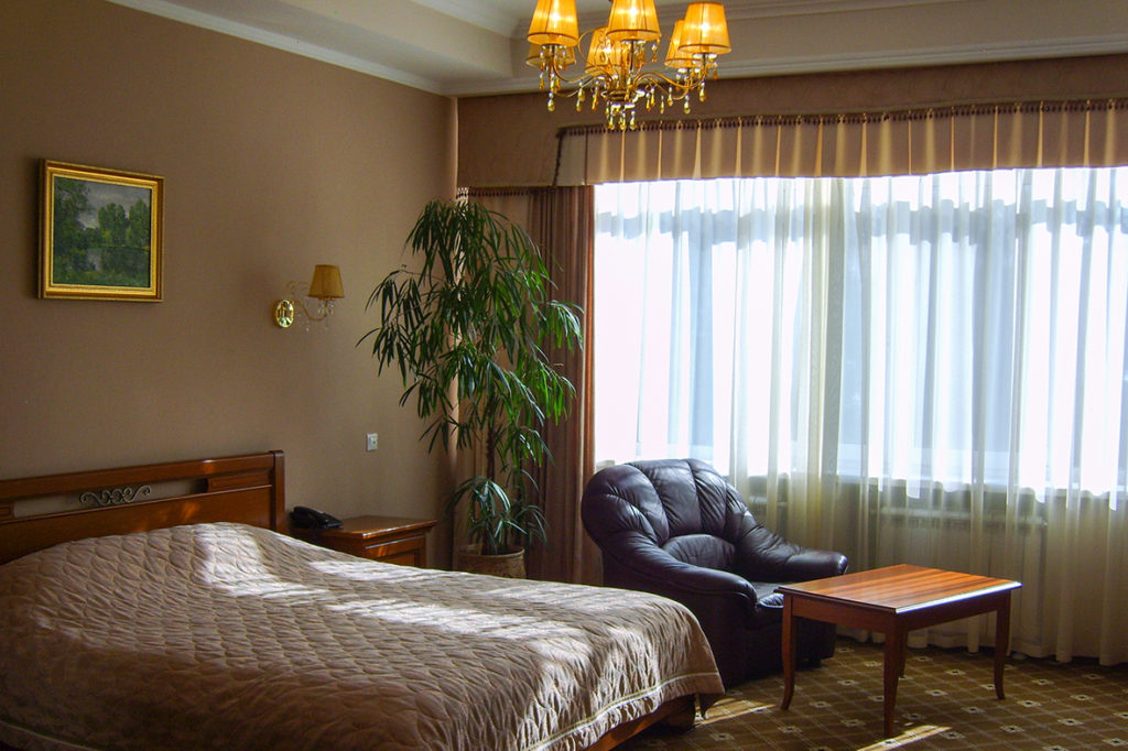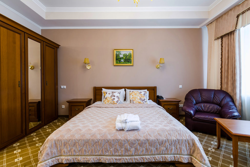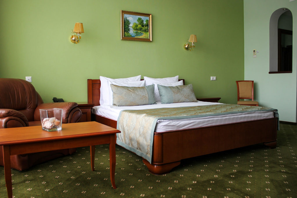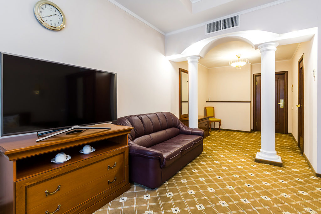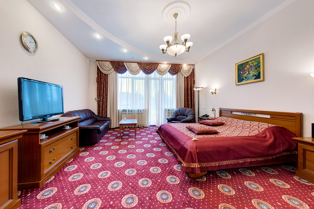 Площадь номера - 42 кв.м. 2 осн. места. 1 доп. место. Балкон. Мебель: вешалка, диван, кровать двуспальная, набор мягкой мебели, прикроватные тумбочки, стол, стулья, шкаф. Оборудование: кондиционер, сейф, телевизор, телефон, холодильник. Санузел: с ванной, с душевой кабиной, тапочки, туалетные принадлежности, фен, халат. Сервис: смена полотенец, смена постельного белья, уборка номера, услуги телефонной связи по территории отеля.
