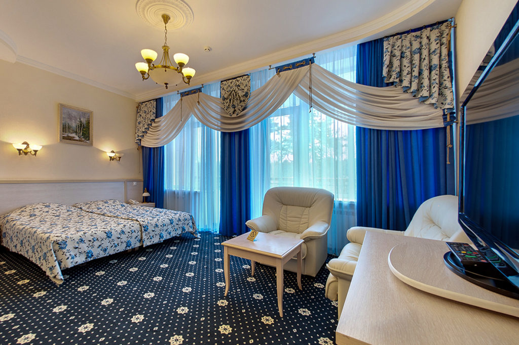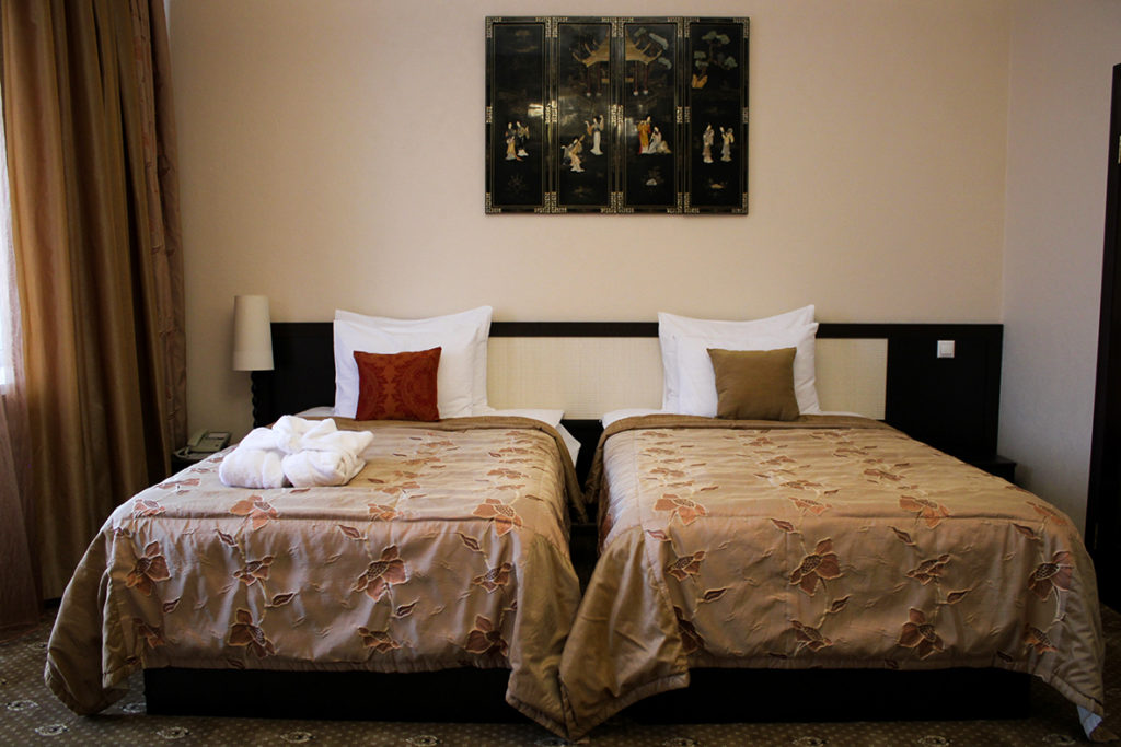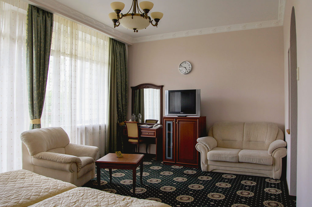 Площадь номера - 35 кв.м. 2 осн. места. 1 доп. место. Балкон. Мебель: вешалка, диван, кровать двуспальная, набор мягкой мебели, прикроватные тумбочки, стол, стулья, шкаф. Оборудование: кондиционер, сейф, телевизор, телефон, холодильник. Санузел: с душем или ванной, тапочки, туалетные принадлежности, фен. Сервис: смена полотенец, смена постельного белья, уборка номера, услуги телефонной связи по территории отеля.